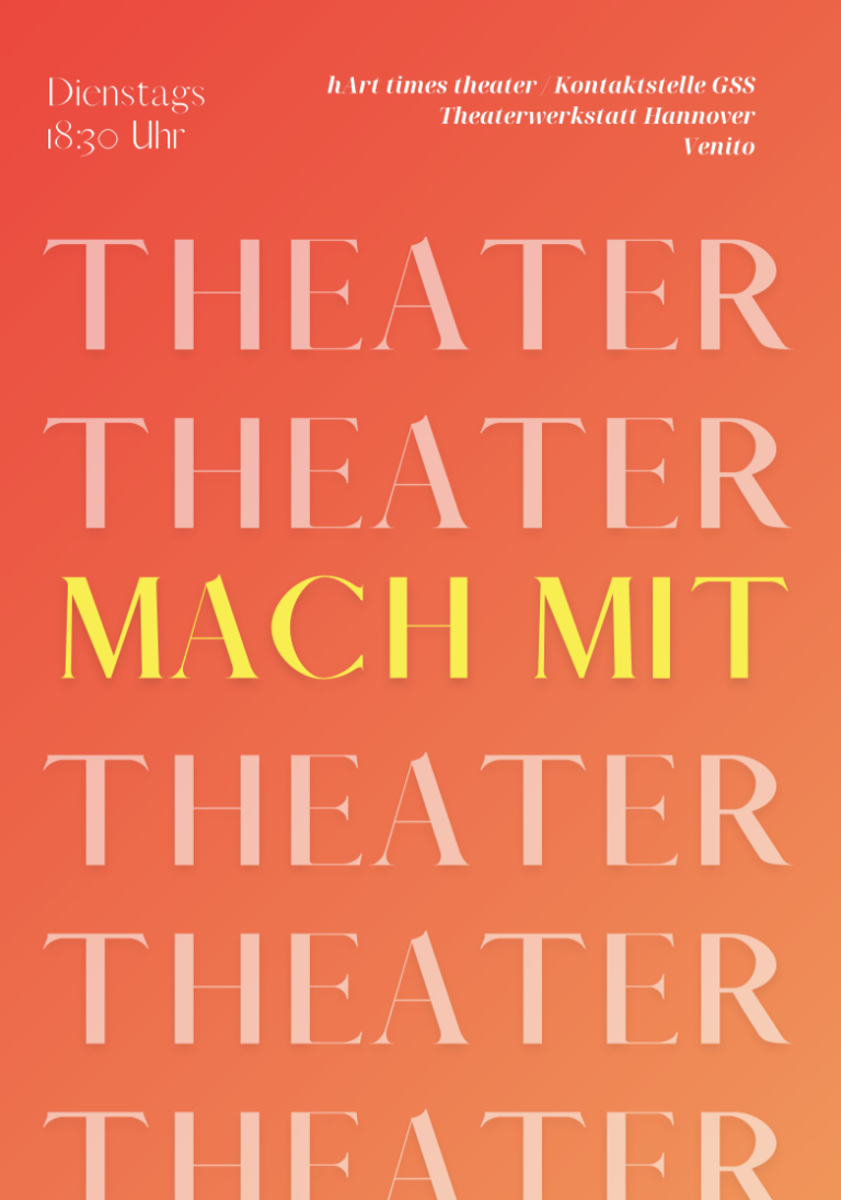 WIR SUCHEN DICH! Das hArt times theater der Kontaktstelle GSS, die Theaterwerkstatt Hannover und Venito suchen junge Menschen, die Lust haben, Theater zu spielen. Du bist zwischen 15 und 25 Jahren alt? Du hast Lust, dich auszuprobieren, Theaterluft zu schnuppern, gemeinsam im Team kreativ zu sein – auch ohne Vorerfahrung? Dann mach mit bei unserem…
